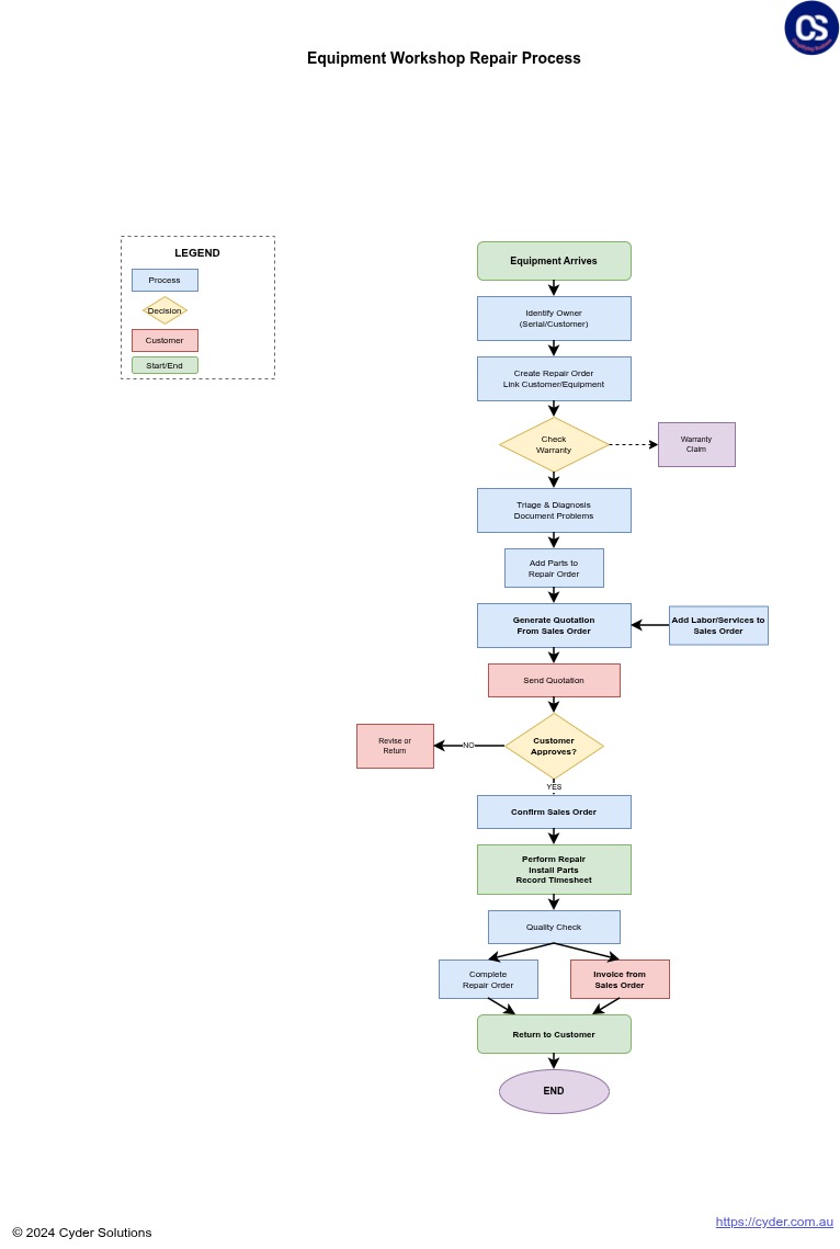 Workshop Repairs vs Field Service: The system distinguishes between workshop repairs (equipment brought to your facility) and field service (technicians travel to equipment location). Workshop repairs use Odoo's standard repair order functionality enhanced with client equipment and warranty integration, while field service uses a separate field service module.