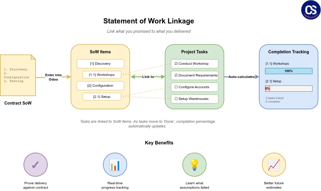 The cs_project_issue module bridges the gap between the contractual reality of the SoW and the operational reality of task execution.